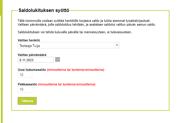 Uusi liukumasaldo kohtaan laitetaan mitä saldo tulisi olla. Paina Tallenna.