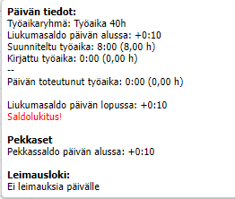 Työaikakalenterilla saldolukitus näkyy päivän tiedoissa, sekä päivän perässä punaisella tähti- merkinnällä.